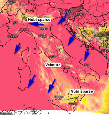Non fatevi ingannare dall’immagine. Quelle che vedete sono nubi in prevalenza medio-alte. Addensamenti più compatti sono presenti sul medio-basso Adriatico e al meridione stante l’imposizione di un flusso da nord-est che ci terrà compagnia per qualche giorno.