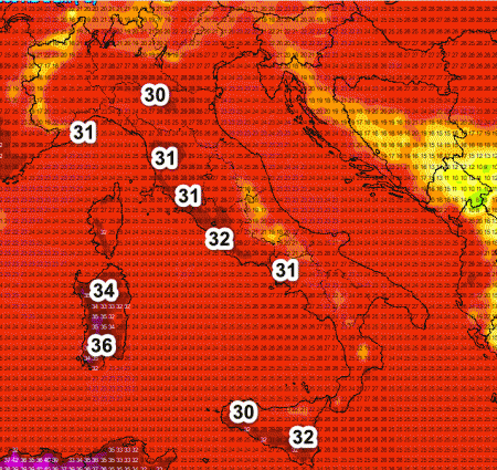 Punte di 34-36° sulla Sardegna. Temperature di poco superiori a 30° sulle coste liguri, lungo tutto il Tirreno e la Sicilia. Sul resto d’Italia valori inferiori a 30°.