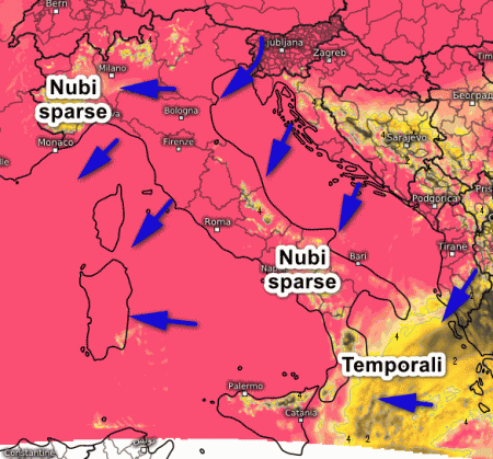 Nubi sparse al nord-ovest e sull’Appennino centro-meridionale senza piogge. Temporali sullo Ionio con possibili estensioni alle estreme regioni meridionali. Sul resto d’Italia stabile, soleggiato e caldo sopportabile.