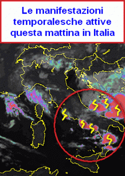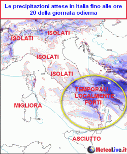 La zona "nevralgica" sarà quella cerchiata in giallo, ovvero tra il basso Lazio, l’Abruzzo e le regioni meridionali, ad eccezione della Sicilia e delle zone estreme. In questo settore si prevedono ancora temporali piuttosto organizzati e localmente intensi, che lasceranno spazio ad un miglioramento solo in serata.