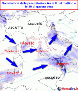 In altre parole, le regioni che si trovano sopravvento al flusso portante ricevono accumuli piovosi anche consistenti, mentre le zone che restano sottovento alle catene montuose (Alpi e Appennini) non presentano fenomeni degni di nota.
