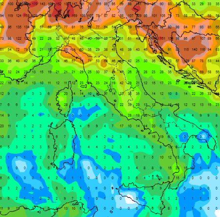 E quanta pioggia cadrà da qui alla fine del mese? Si notano accumuli piuttosto abbondanti al nord, specie su Alpi, Liguria di Levante, Lombardia e Triveneto, in qualche caso rilevanti anche al centro, molto meno significativi o addirittura trascurabili al sud per tutto quanto ci siamo detti: