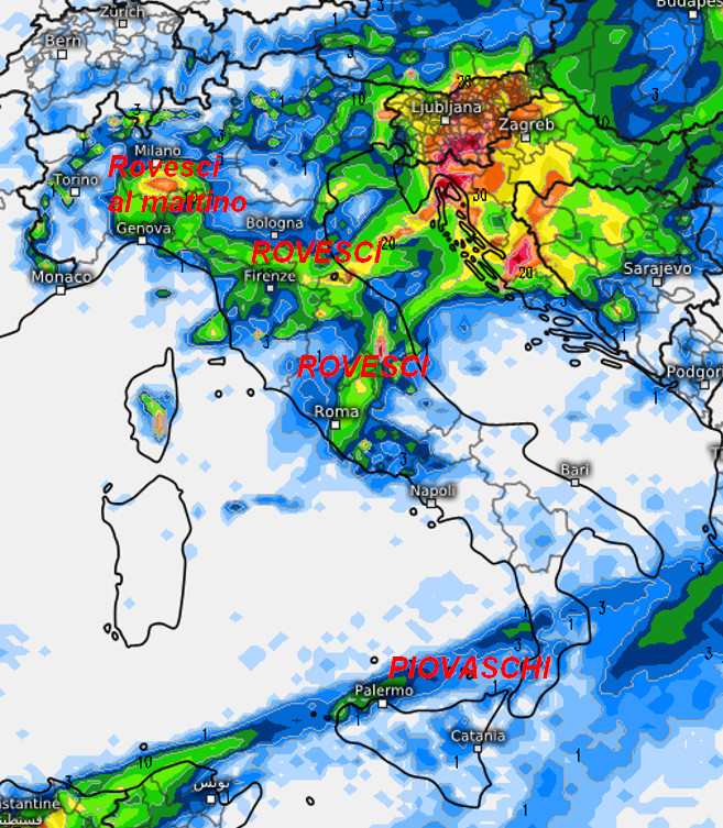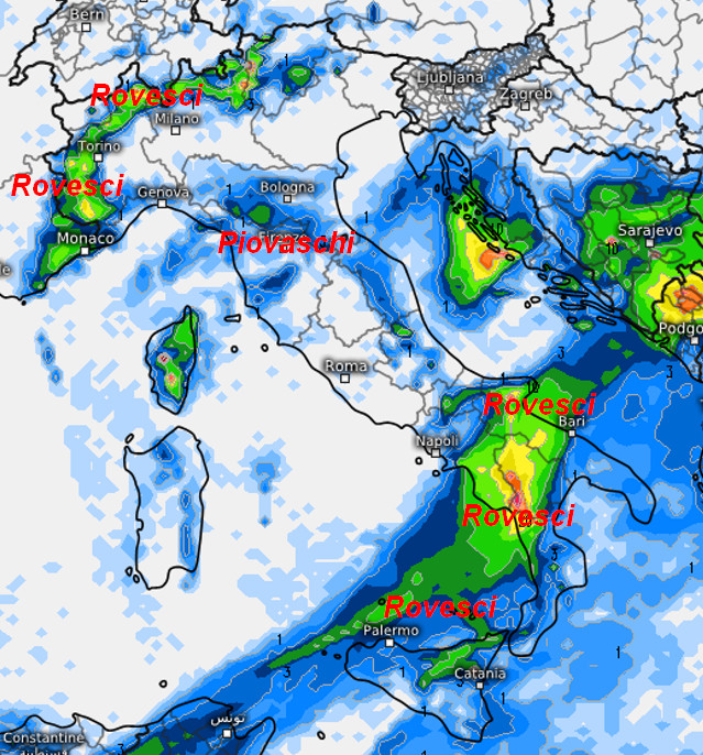 Il corpo nuvoloso al sud subirà un rinforzo ed interesserà con rovesci la Sicilia, ma soprattutto la Calabria, la Lucania e la Puglia dove avremo anche dei temporali. Piovaschi pomeridiani tra Appennino settentrionale ed umbro-marchigiano; rischio di temporali anche al nord, specie su ovest/nord Piemonte ed alta Lombardia.
