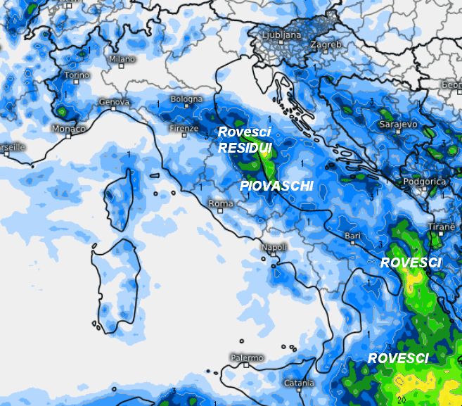 Ancora rovesci sul Medio Adriatico e sull’Emilia Romagna, ma decisamente meno intensi rispetto ai giorni precedenti. Si tratterà infatti di una fase residua che nell’arco della giornata dovrebbe migliorare. Rovesci sono attesi anche sulla punta estrema della Puglia e sullo Ionio, qui anche con temporali. Sul resto d’Italia non si prevedono fenomeni a parte forse qualche piovasco sulle Alpi occidentali nel pomeriggio, ma cose di poco conto.