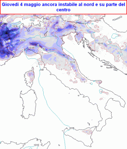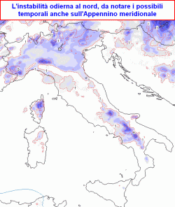 L'instabilità si protrarrà sino a giovedì sera. Marginale coinvolgimento odierno dell'Appennino meridionale. Venerdì sole ovunque, tra sabato pomeriggio e domenica nuovo passaggio instabile al nord e poi sulle zone peninsulari del centro e del sud, asciutto sulle isole maggiori. Da lunedì ancora un po' di variabilità, temperature in rialzo al nord.