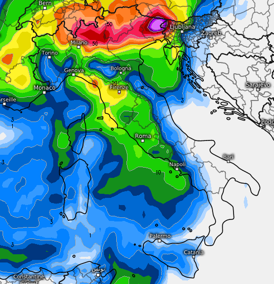 Diamo anche un’occhiata alla distribuzione delle precipitazioni, che risulteranno più abbondanti sul Triveneto e la Lombardia centro-orientale, anche se naturalmente si tratta solo di una prima proiezione: