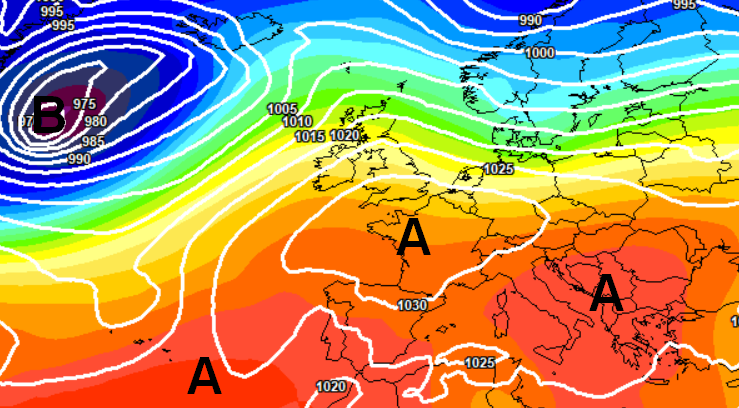 Questa situazione di tempo stabile e mite, con il flusso perturbato atlantico che correrà a latitudini più settentrionali, potrebbe durare massimo 4-5 giorni, qui lo vediamo nel suo momento di massimo splendore, nella giornata di mercoledì 23: