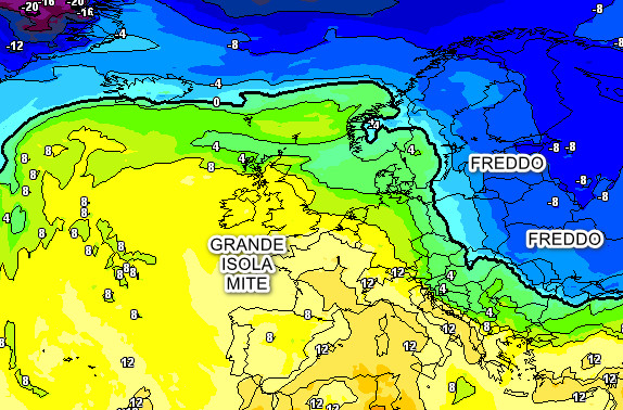 Da notare come una veloce ondata di freddo passerà non troppo lontano da noi nell’arco del prossimo week-end e andrà a colpire i Paesi dell’Europa orientale e la Vicina Russia. Notate però la vastità della mitezza che terrà sotto scacco il resto del Continente, con isoterme che arriveranno a + 12° alla medesima quota nel Mediterraneo, un valore praticamente estivo.