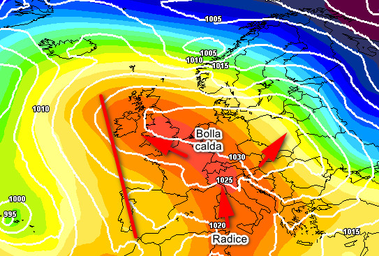 In questa mappa si nota il meccanismo che tiene in piedi l’impalcatura anticiclonica sul nostro Continente. Notate la radice del “mostro” che dal nord Africa inietta aria tropicale verso nord; questa tende ad espandersi ed a gonfiare come una vela l’anticiclone. Fin tanto che la radice anticiclonica non verrà recisa, la situazione non cambierà. Ovviamente tutte le perturbazioni sono messe al palo da questo macigno e nulla possono, se non slittare verso nord senza interessarci.