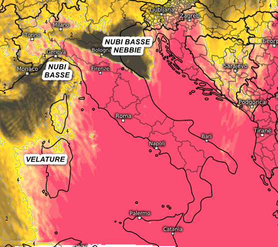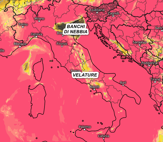Banchi di nebbia sulla Pianura Padana orientale, in attenuazione nelle ore centrali della giornata, per il resto soleggiato a parte velature o nubi di poco conto.