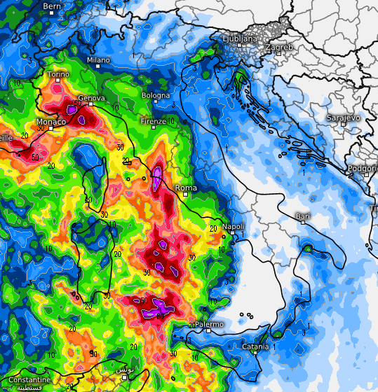 Ed ecco la mappa con la distribuzione dei fenomeni prevista tra martedì 24 e mercoledì 25 settembre sempre secondo il modello ECMWF, con i fenomeni che dai versanti tirrenici sembrano muoversi gradualmente verso levante, colpito soprattutto il Ponente ligure, bassa Toscana, Lazio e Sardegna, ma subito dopo anche Campania e Sicilia: