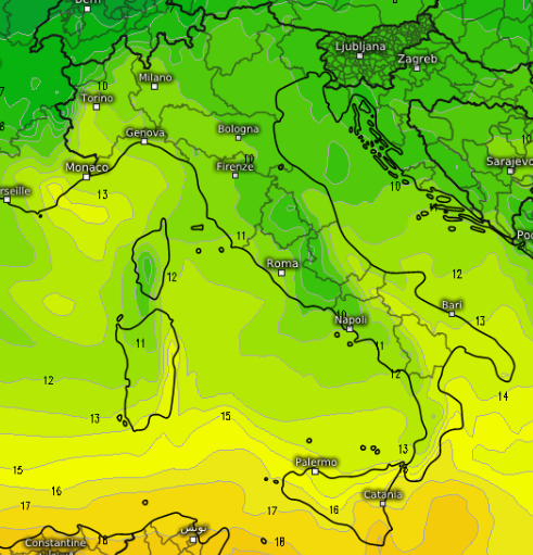 Ed ecco le temperature attese a 1500m che testimoniano l’ingresso dell’aria fresca e l’arretramento del caldo, ormai limitato alla sola Sicilia: