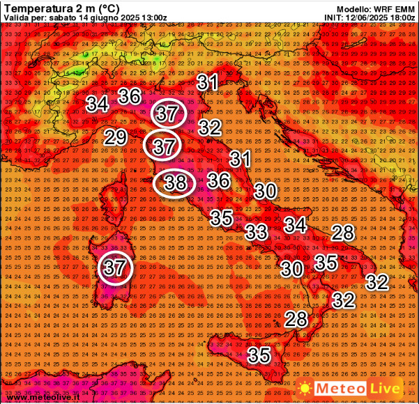 Termometro a 38° nelle aree interne della Toscana, 37° su Romagna, Sardegna, 36° sull’Umbria. Come vedete, quasi tutte le aree italiane presenteranno temperature superiori a 30° a parte alcune aree costiere soggette a brezze termiche.