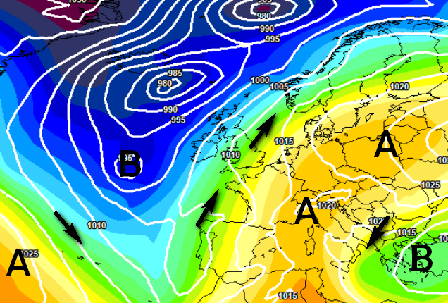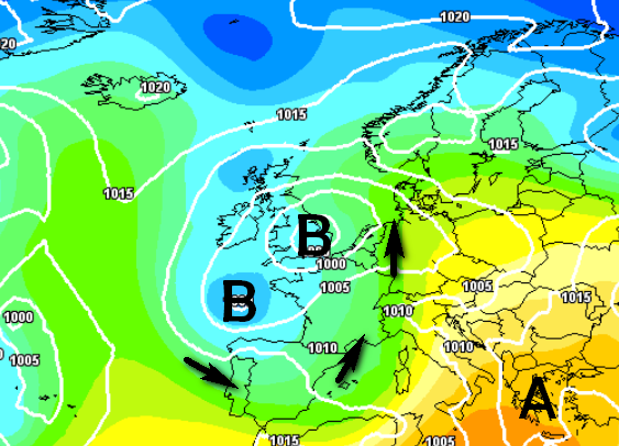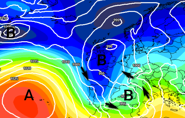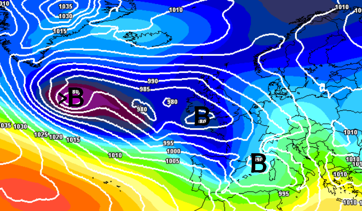 Il maltempo però è descritto in modi differenti. Non avete notato niente guardando le due mappe sopra? Il modello americano vede una famiglia di cicloni colpirci quasi senza sosta, quello europeo vede invece una pausa tra un ciclone e l’altro e quella pausa secondo lui la vivremo proprio nel fine settimana di Pasqua, come si vede qui sotto: