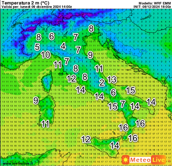 Vediamo adesso il quadro delle temperature attese in Italia questo pomeriggio alle ore 14: