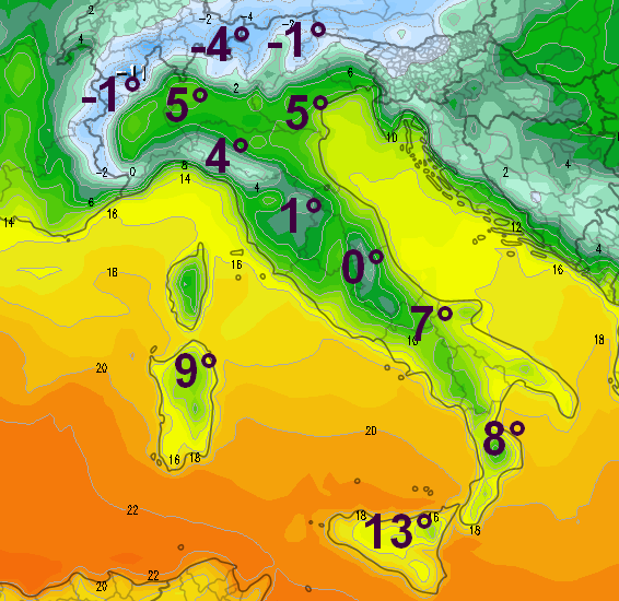 In ogni caso potranno registrarsi 4-5°C in Valpadana, valori più bassi nei fondovalle alpini grazie alla serenità del cielo con Aosta, Domodossola, Trento, Bolzano e Sondrio sotto lo zero, giusto per citare alcune località. Freddo anche sulle zone interne del centro con soli 2°C a Perugia, 3°C a Terni e Spoleto, 4°C a Fabriano, 0°C a L’Aquila, 5°C a Macerata, anche qui citati a titolo di esempio.