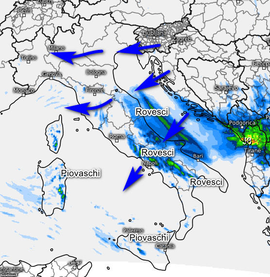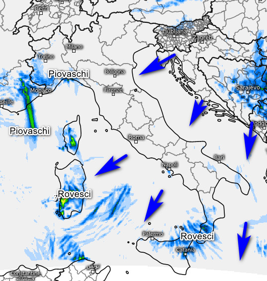Tempo in veloce peggioramento a partire dal versante adriatico centro-meridionale con piogge e rovesci sparsi che si muoveranno rapidamente dal mare Adriatico verso le aree interne e il Tirreno. Notevole rinforzo del vento da est, brusco calo termico e moto ondoso in subitaneo aumento lungo le coste adriatiche. Piovaschi agiranno anche tra Sicilia e Sardegna, per il resto tempo asciutto, ma con venti da est anche sostenuti sulle pianure del nord, con forse qualche rovescio in Romagna.