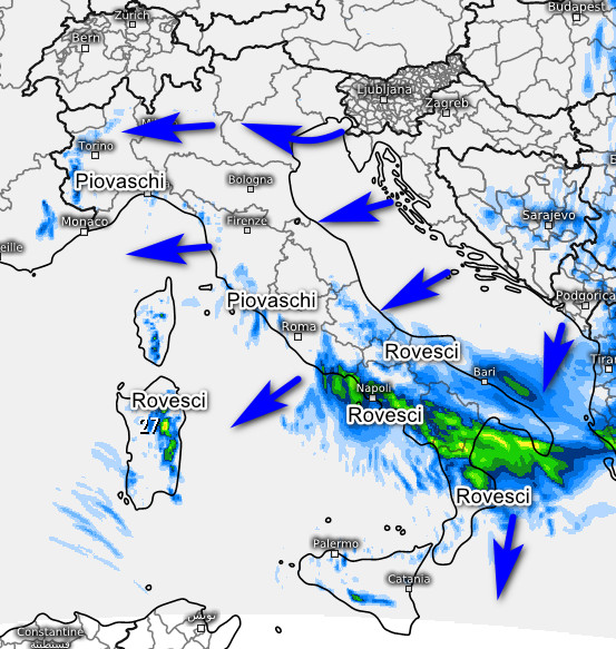 Acquazzoni sulla Sardegna orientale, la Campania, la Calabria, il Golfo di Taranto, la Lucania e la Puglia, accompagnati da forti venti tra est e nord-est. Ulteriore calo termico e quota neve in calo sull’Appennino centro-meridionale fino a 900 metri. Qualche piovasco anche al nord-ovest, specie tra la Liguria e le Alpi occidentali, unitamente ad alcune aree della Toscana, ma cose di poco conto. Miglioramento invece sull‘alto e medio versante adriatico, ma con temperature in calo.