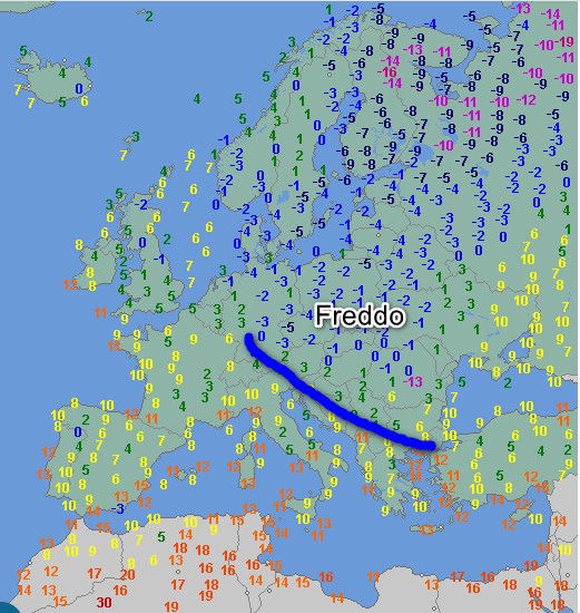 Notiamo quasi tutta l’Europa nord-orientale con temperature al di sotto dello zero, anche pesantemente in prossimità della Svezia e della Finlandia. Il fronte di irruzione fredda interessava nella prima mattinata di domenica 6 la Penisola Balcanica, ma tenderà a travasare verso l’Italia entro il pomeriggio.