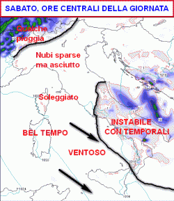 Più turbolenta si manifesterà la situazione sul medio Adriatico e al meridione. Qui il rischio di piogge o temporali sarà ancora elevato, il tutto sotto venti freschi ed intensi da nord-ovest. In serata, lentamente, la situazione tenderà a migliorare e domenica gli spazi soleggiati saranno nettamente prevalenti sugli addensamenti nuvolosi.