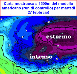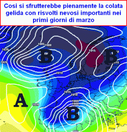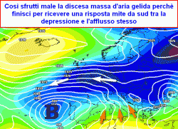 Finisce allora che la massa gelida va a collegarsi ad una depressione in pieno Atlantico a migliaia di km di distanza: ne nascerebbe sicuramente poi un collegamento sino alle nostre regioni ma molto blando e soprattutto con un contributo mite ed umido che finirebbe per mangiarsi in breve tempo tutto il freddo precedentemente affluito.