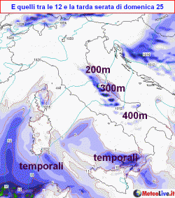 SITUAZIONE: la circolazione depressionaria presente sul nostro meridione verrà ulteriormente rinvigorita dall’inserimento di un nucleo di aria fredda, che abbasserà ovunque le temperature tra domenica e lunedì, determinando instabilità su medio Adriatico, Sardegna e meridione, con risvolti nevosi sino a 200-300m su Marche ed Abruzzo, sino a quote collinari al sud.
