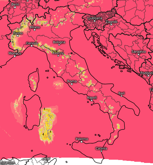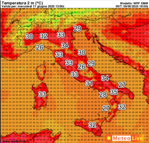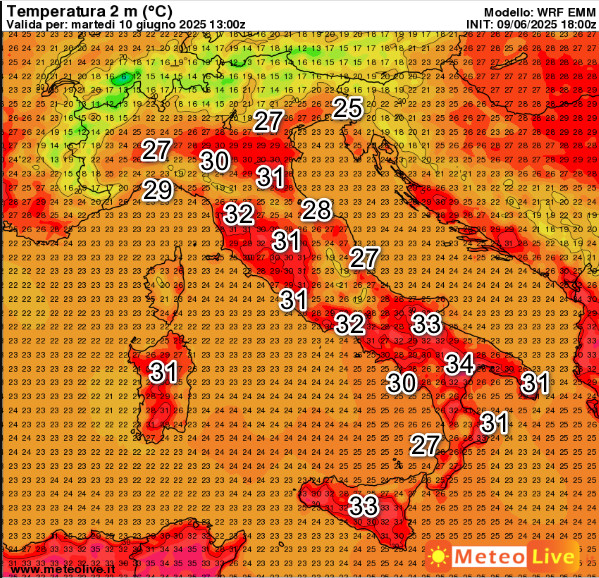 Punte di 34° sulla Lucania, 33° sulla Puglia e sulla Sicilia, 32° nelle aree interne della Toscana e sulla Campania. Temperature leggermente più gradevoli sul Piemonte occidentale e il medio versante adriatico, anche se il flusso da est tenderà ad attenuarsi.