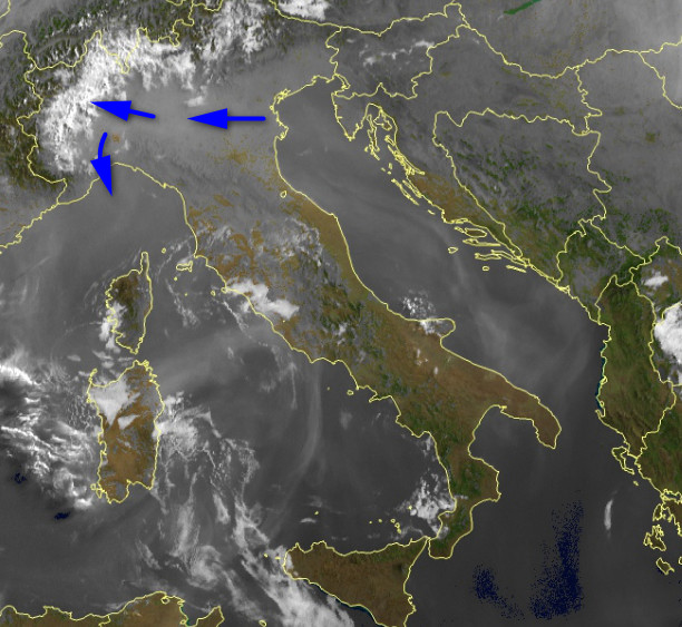 Le correnti instabili da nord-ovest che fino a domenica scorsa hanno lambito le Alpi, come era nelle attese hanno lasciato un piccolo ricordo che si è manifestato sulle regioni settentrionali nelle ultime 24 ore. Correnti al suolo relativamente più fresche da est hanno interessato la Valpadana, andandosi ad ammassare sui rilievi alpini occidentali e settentrionali. Nella notte c’è stato anche qualche rovescio in loco, che ha lasciato al suolo pochi millimetri. Vediamo come si presenta la situazione di martedì mattina alle 8:00 attraverso l’ultima immagine satellitare disponibile: