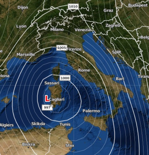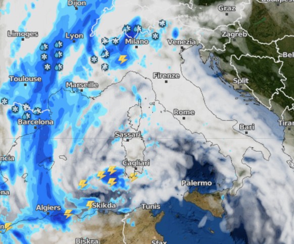 Una vasta figura depressionaria si sta mettendo in moto verso l’Italia con un vortice ciclonico in risalita dall’Algeria verso la Sardegna, che non solo ha già portato ad un generale aumento delle nubi, ma è pronto ad attivare forti venti di Scirocco tra lo Jonio e l’Adriatico, poi di Tramontana e Maestrale sul Tirreno ma soprattutto condizioni di maltempo al nord e su parte del centro, con piogge già dalla serata odierna su Piemonte, Lombardia, Valle d’Aosta e Sardegna.