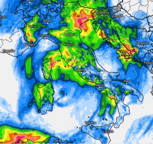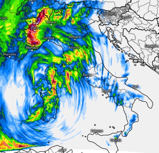 Si notano le intense precipitazioni attese sul Piemonte, le piogge in Lombardia, ma anche i rovesci sul nord-est, pur disturbati dalla sostenuta ventilazione sciroccale, la circolazione ciclonica delle correnti intorno alla Sardegna con molti nuclei temporaleschi, che investiranno anche Toscana ed alto Lazio, sporadicamente il resto del Lazio e la Campania, più ai margini medio Adriatico e Sicilia.