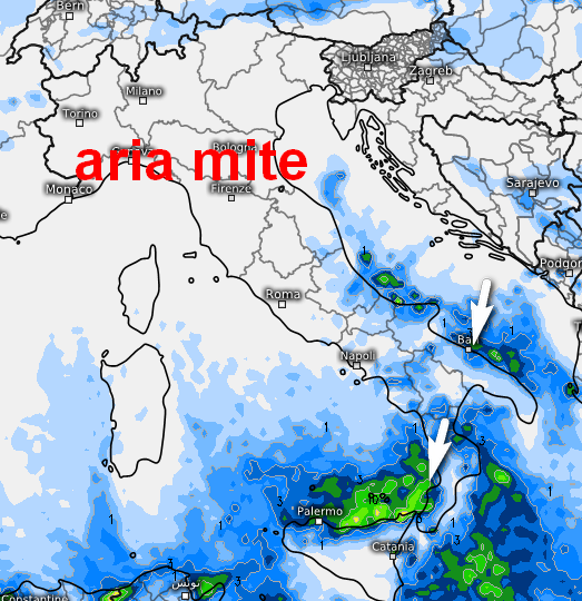 Inizialmente però, segnatamente nella giornata di lunedì 16 dicembre, il sud e marginalmente il medio Adriatico, verrà raggiunto ancora da una corrente fresca ed instabile da nord-est, in grado di determinare annuvolamenti irregolari e qualche precipitazione sparsa, più intensa su nord Sicilia e Calabria tirrenica, come vediamo qui sotto: