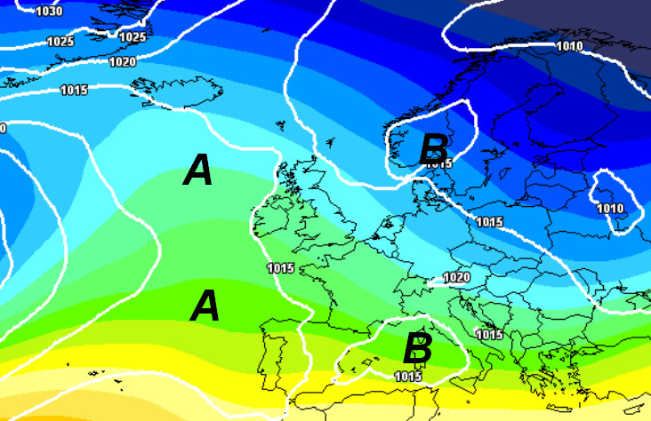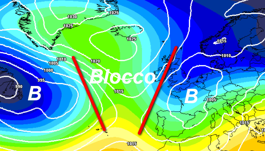 Situazione di blocco delle correnti zonali (da ovest verso est), stante una vistosa frenata del vortice polare. Due blocchi freddi si notano sulla mappa: uno in prossimità della costa orientale americana e l’altro in Europa, che interesserà anche il centro-nord della nostra Penisola.
