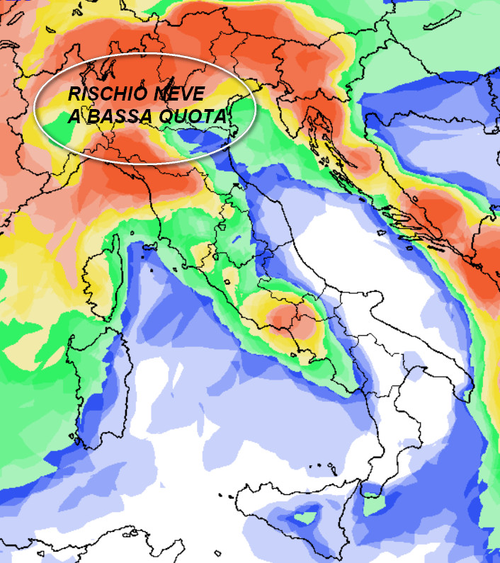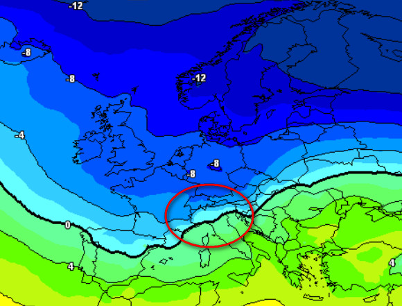 Sulla verticale del settentrione si evincono valori termici a 1500 metri compresi tra 0 e -2° che in caso di precipitazioni (come dalla mappa sopra) saranno fautori di nevicate a bassa quota, se non addirittura in pianura su diversi settori dell’alta Italia. Sul resto d’Italia la quota neve sarà invece più elevata.