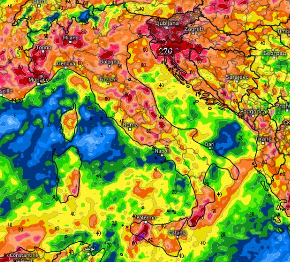 Colpiscono soprattutto gli accumuli all’estremo sud, mentre è più “normale” registrare piogge copiose sul settentrione. Qualcuno si chiederà: ma non ci sono anche carte più ottimistiche, che strizzano l’occhio ad una rimonta caparbia dell’anticiclone? Si, ci sono, ma al momento sono inferiori al 30% degli scenari proposti, eccone una giusto per accontentarvi ma non fateci troppo affidamento: