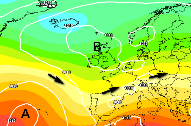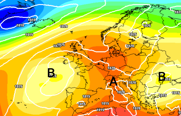 Vedete bene come una saccatura avvolga il nord e il centro Italia, come la vasta depressione sul Regno Unito domini la scena europea e come al contrario l’anticiclone delle Azzorre rimanga di quinta in Atlantico, quasi intimidito da tanta veemenza. Così l’estate non può decollare. Lo possono fare invece temporali e nubifragi, che infatti non dovrebbero mancare.