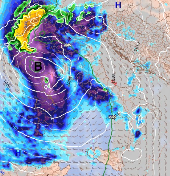 Questa depressione così profonda è più tipica dell’autunno che della primavera ma, stante il mare già sufficientemente caldo, si attiverà e si scaverà con relativa facilità, dando origine a venti da ESE sino a 100km/h lungo l’Adriatico, sino a 50km/h in Valpadana e a precipitazioni molto abbondanti sul settore di nord-ovest.