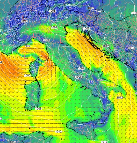 A proposito del vento ecco una mappa prevista per l’alba di giovedì, si nota il profondo vortice ciclonico tra il nord della Corsica, la costa Azzurra e il Mar Ligure: