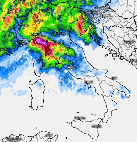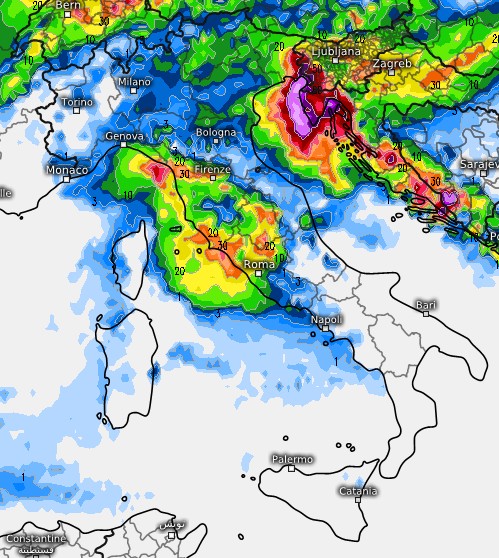 Qui la sommatoria dei fenomeni tra la serata del 20 e la mattinata del 21 agosto sempre secondo ECMWF, dove si nota anche il coinvolgimento del Lazio e una temporanea tregua al nord-ovest, con gli ultimi fenomeni che al nord colpiranno la Venezia Giulia: