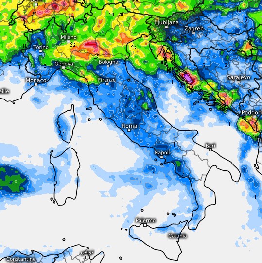 Le prime a subire gli effetti della perturbazione saranno le regioni settentrionali. Qui, il maltempo farà il suo ingresso in grande stile con un doppio passaggio temporalesco. Il primo fronte porterà piogge e rovesci già a partire dal 20 agosto, ma sarà il secondo impulso a determinare il crollo definitivo delle temperature, regalando un assaggio di clima molto fresco. L’interazione tra l’aria fredda in arrivo e il calore accumulato al suolo rischia di generare fenomeni di forte intensità, con rovesci localmente intensi e un sensibile abbassamento delle massime. Colpite tutte le principali città del settentrione, tranne inizialmente quelle dell’Emilia-Romagna, che rimarranno sottovento a causa del Garbino, guarda la mappa della sommatoria dei fenomeni del 20 agosto: