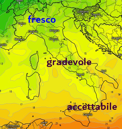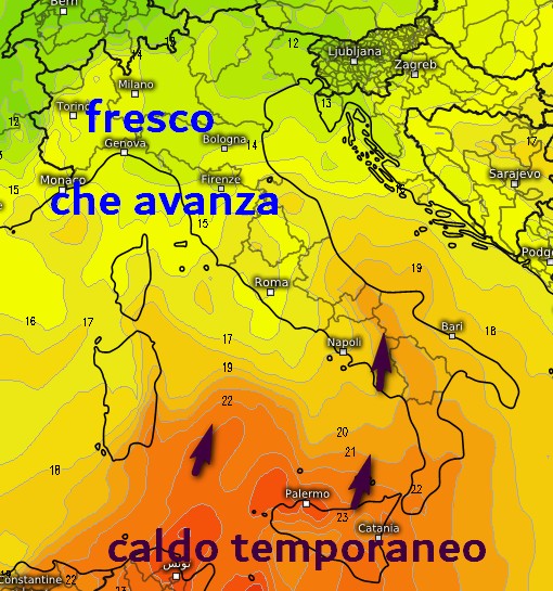 Questa seconda passata riporterà le precipitazioni al nord ma un veloce passaggio interverrà anche al centro, sul medio Adriatico e sulla Campania, perché le correnti nel volgere di breve ruoteranno a nord-ovest. Ed ecco le conseguenze sul piano termico a 1500 per l’alba di venerdì 22 agosto: