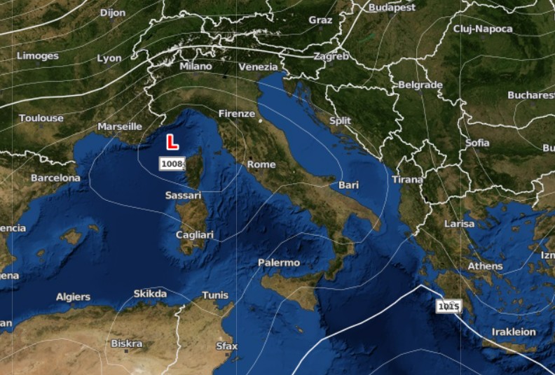 L’assalto sarà favorito dalla formazione sul Golfo Ligure di un minimo pressorio al suolo che vedete qui in questa ricostruzione di Wetterdienst sulla base delle informazioni fornite dal modello ICON: