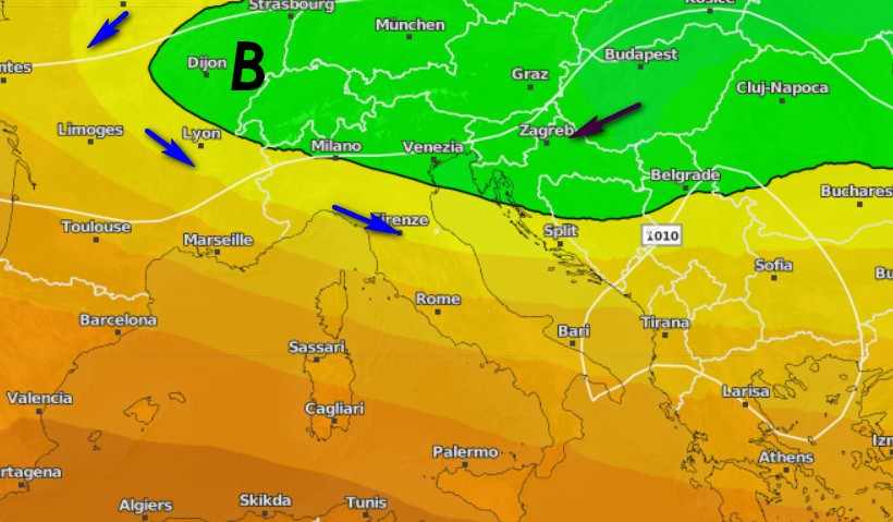 Ed ecco anche il piano sovrapposto dei 5500m che mette in evidenza l’ansa depressionaria in quota a 5500m colma di aria fredda che tende ad abbracciare le Alpi sempre nella serata di lunedì 20 aprile: