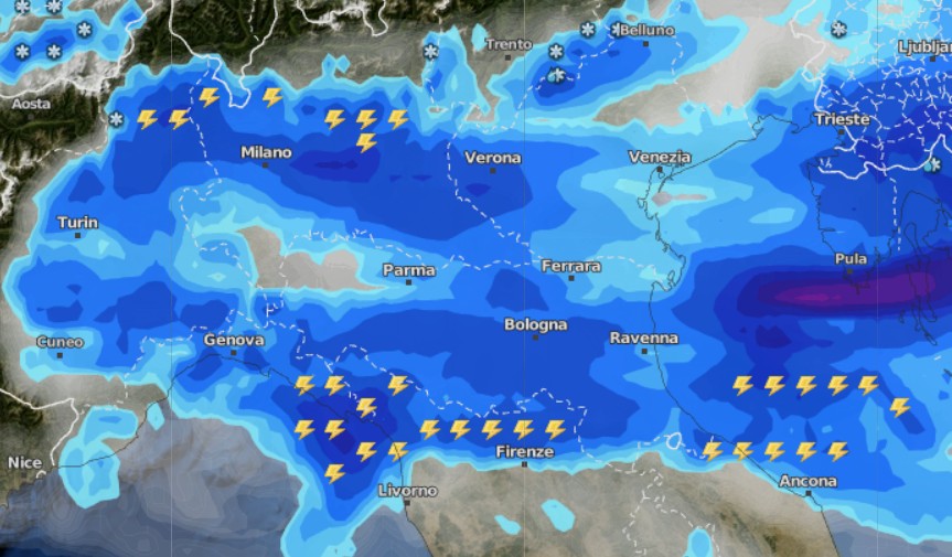 Nella notte su martedì 21 ecco le precipitazioni portarsi leggermente più a sud fino ad investare parte della Toscana lungo una linea Firenze-Livorno, così come sul nord delle Marche sino ad Ancona:
