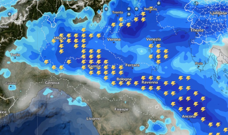 Le temperature crolleranno di altri 4-5°C e nella notte in Valpadana non si supereranno i 12-13°C, nelle Alpi oltre i 1800m attesa qualche spruzzata di neve.