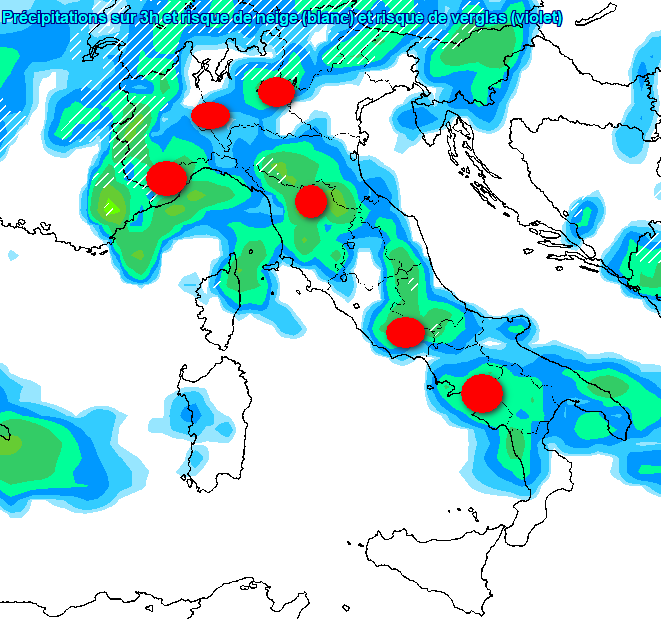 Campania: soprattutto sul Cilento in sfondamento verso la costa. Puglia: meno probabili ma non escluse a carattere sparso tra Barese, Tarantino e Leccese, isolate sul Gargano.
