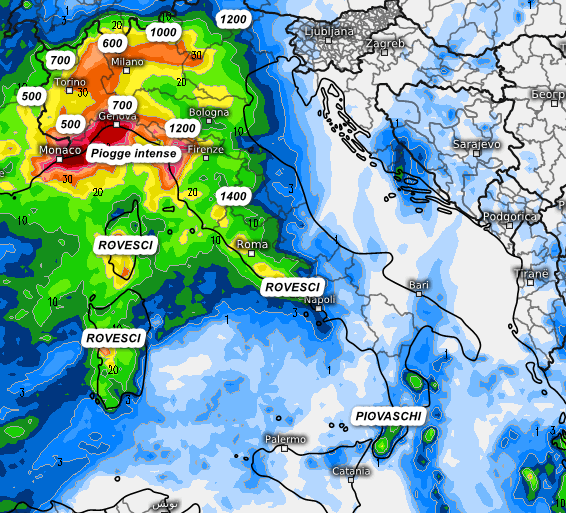 Come abbiamo detto in precedenza, preoccupa un po’ la stazionarietà dei fenomeni dato che la perturbazione sarà bloccata nel suo normale incedere verso levante da una zona di alta pressione che agirà più ad est.