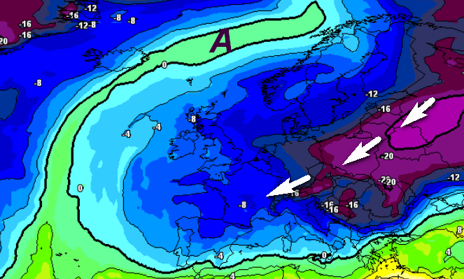 Naturalmente l’irruzione di un ramo del vortice polare nel cuore dell’Europa e del Mediterraneo avrebbe un impatto termico notevole, guardate la mappa termica a 1500m prevista per metà mese: