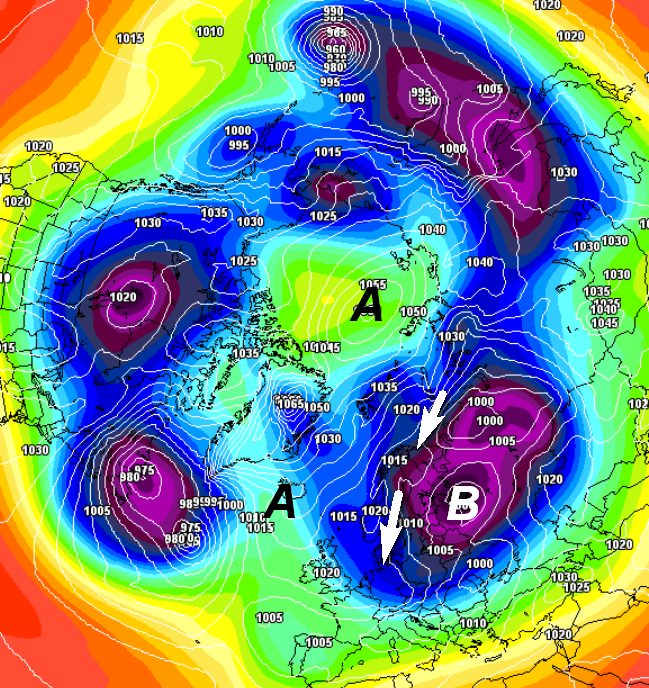 Non tutti però sono orientati verso una soluzione anti-inverno! Anzi, ci sono mappe che nel volgere di breve prevedono la risalita dell’anticiclone fin verso il Polo (si parla del 12-13 gennaio), come si nota in questa carta riferita al nord emisfero: