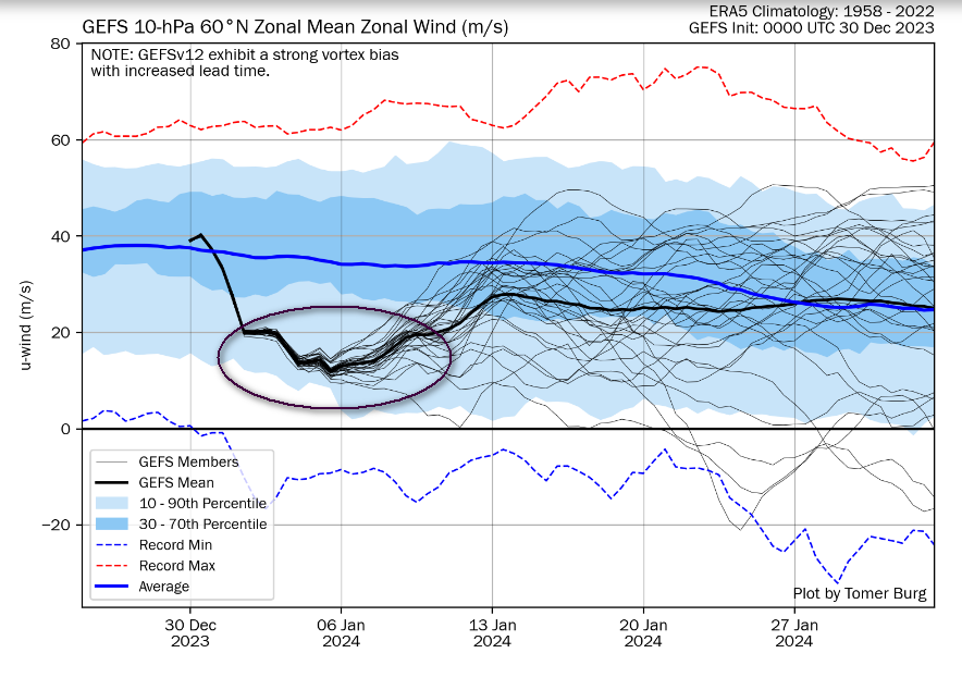 Il problema però resta sempre legato alle correnti da OVEST: quanto spingeranno? Neutralizzeranno ancora l’inverno per l’ennesima volta o rallenteranno anche solo parzialmente, come si vede qui a 30km di altezza, consentendo qualche episodio invernale sin sul nostro Paese? Notate come, nonostante il calo delle velocità zonali atteso da Capodanno, non solo non è prevista alcuna inversione delle correnti, ma poi prevalga ancora un rialzo della velocità di spinta.