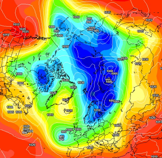 La cosa che però pare più evidente è lo sbilanciamento del quartiere generale del vortice polare verso l’Europa, mentre solitamente questo è posizionato a nord del Canada. Lo vediamo qui sotto in questa mappa che racchiude tutto l’emisfero nord. Si nota chiaramente la lingua blu del vortice polare che scende verso l’Europa meridionale.